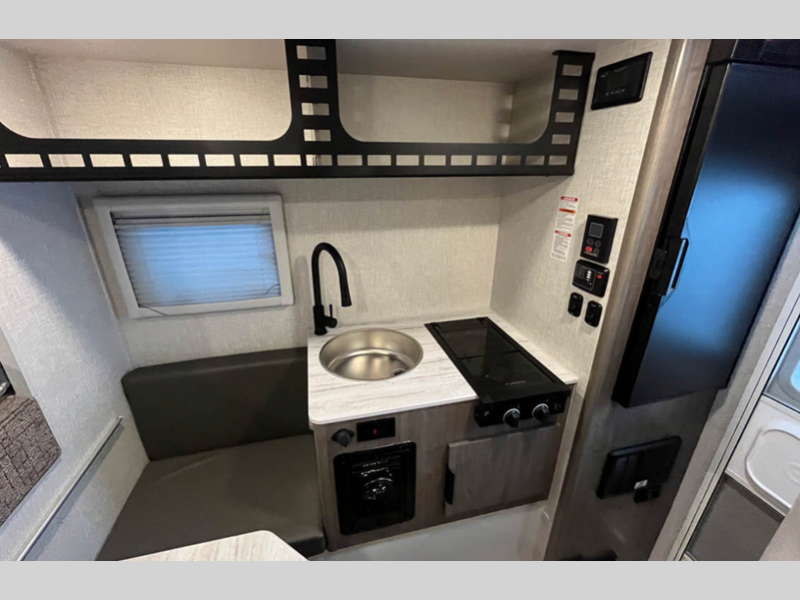 Sleeps 3 Length 12 ft 7 in Ext Width 7 ft 2 in Int Height 6 ft 6 in Interior Color Bronzite, Grayson, Lapis Dry Weight 1486 lbs Fresh Water Capacity 15 gals Grey Water Capacity 14 gals Black Water Capacity 16 gals Furnace BTU 18000 btu Available Beds Queen Refrigerator Type 12V Refrigerator Size 3 cu ft Cooktop Burners 2 Floor Length 6 ft 10 in LP Tank Capacity 5 gals Water Heater Type Girard Number of LP Tanks 1 Body Style Hard-Side Shower Type Wet/Bath Shower -